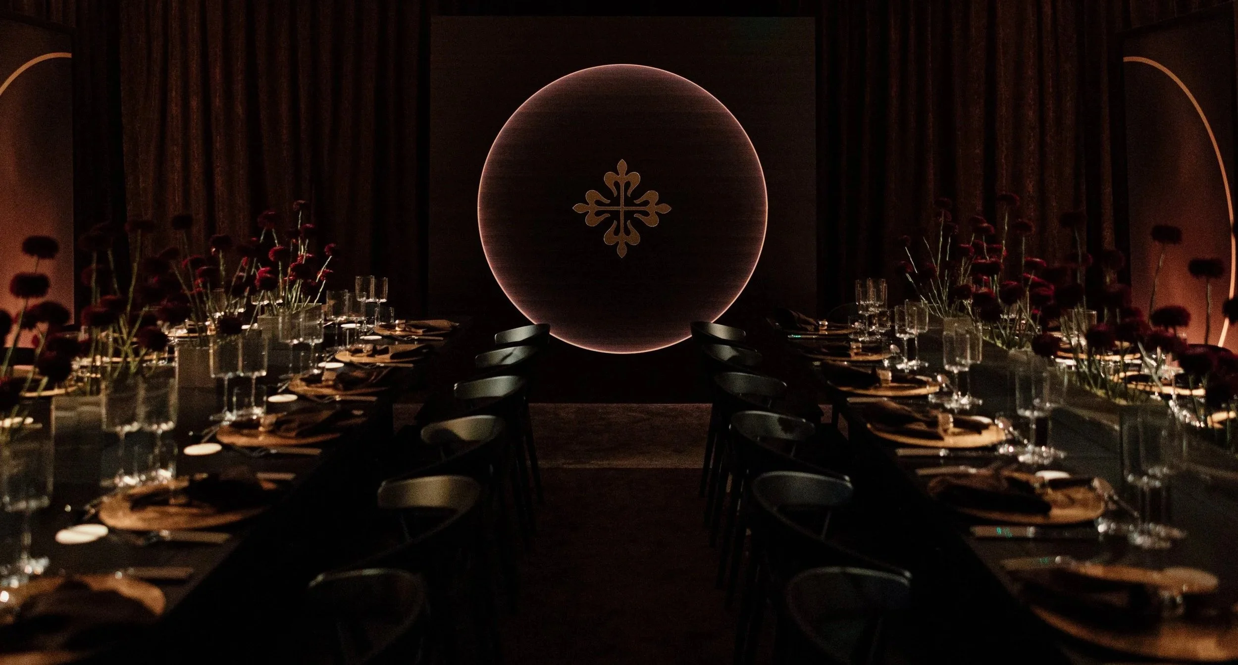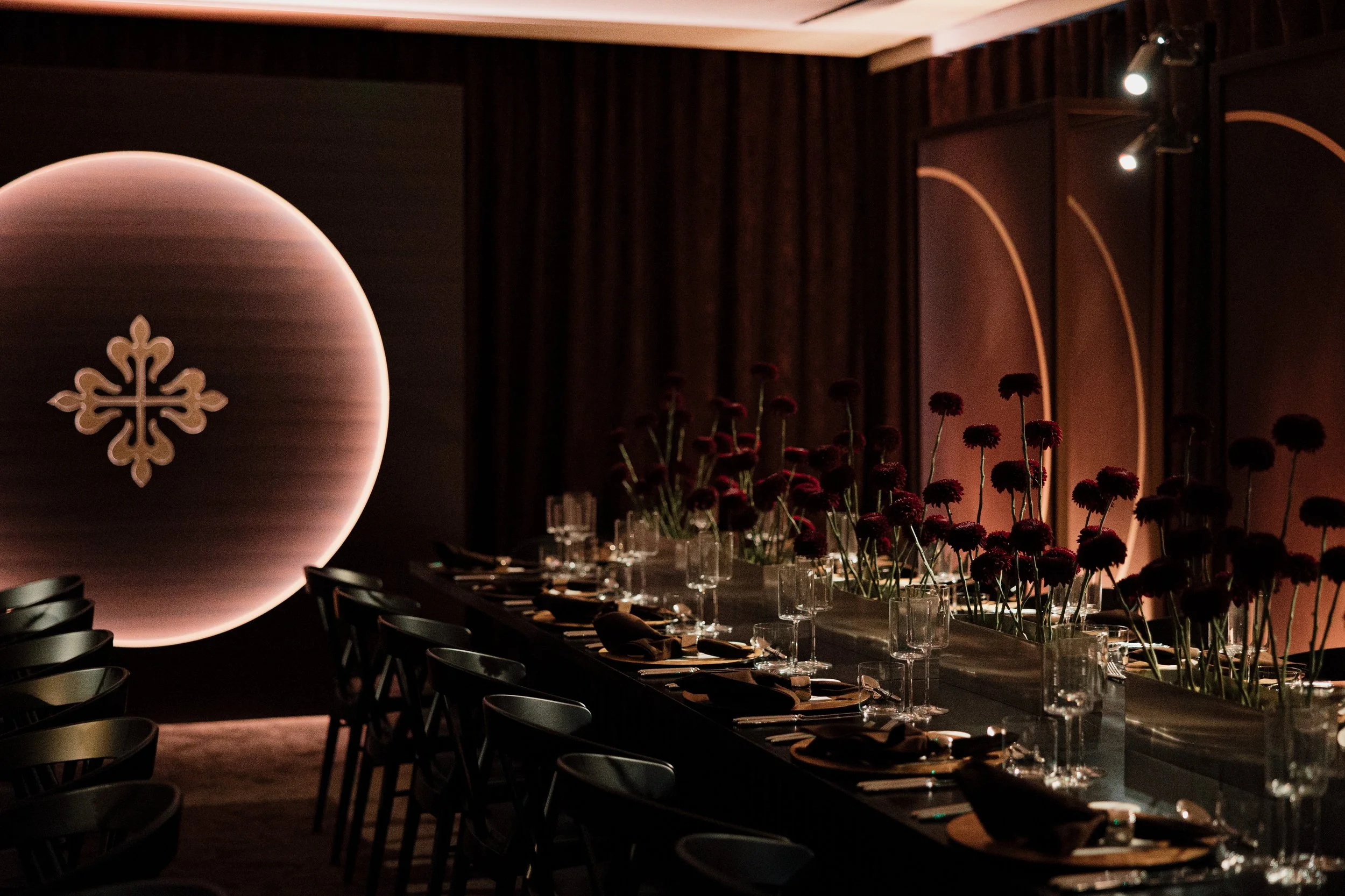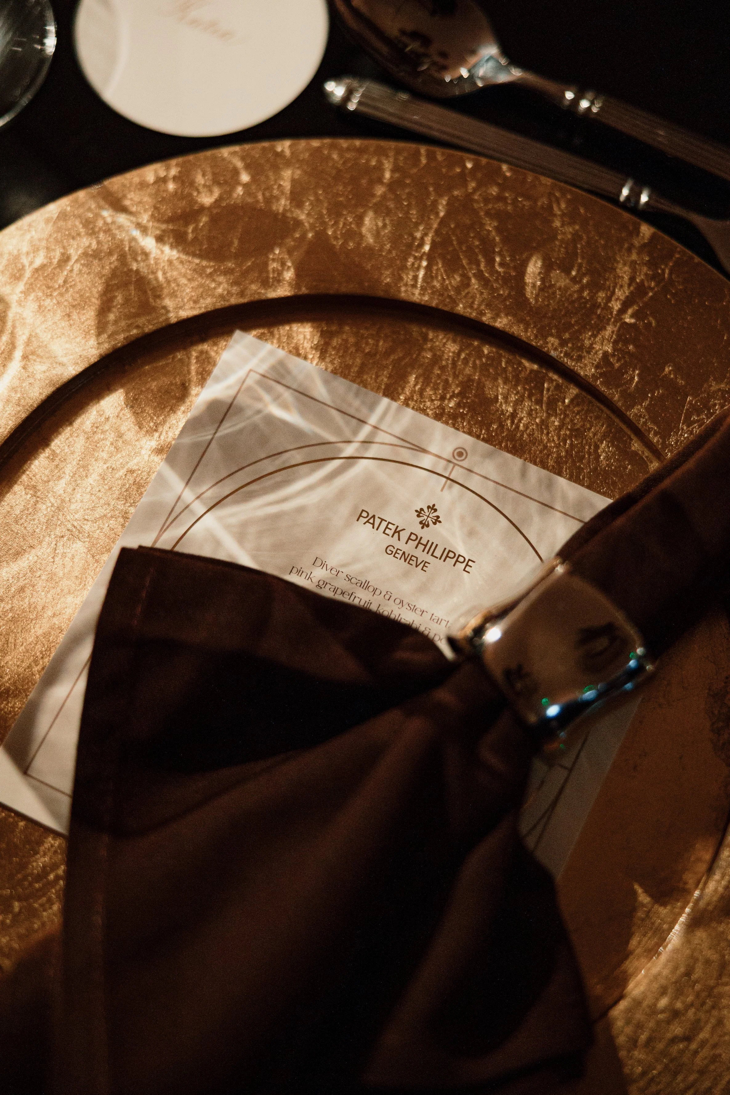 CREATIVE MOTIFS, MATERIALS, AND TEXTURES WERE DRAWN DIRECTLY FROM THE COLLECTION ITSELF AND TRANSLATED ACROSS EVERY MAJOR TOUCHPOINT—FROM BESPOKE HAND-PRINTED INVITATIONS AND MENUS TO CHOREOGRAPHED LIGHTING AND STATEMENT FEATURE WALLS. EACH DETAIL WAS DESIGNED TO BUILD A COHESIVE, DEEPLY IMMERSIVE ENVIRONMENT, ELEVATING THE COLLECTION THROUGH A SENSORY, CULTURALLY-LED DINING AND EXHIBITION EXPERIENCE THAT REFLECTED THE PRECISION, HERITAGE, AND CRAFT AT THE HEART OF PATEK PHILIPPE.